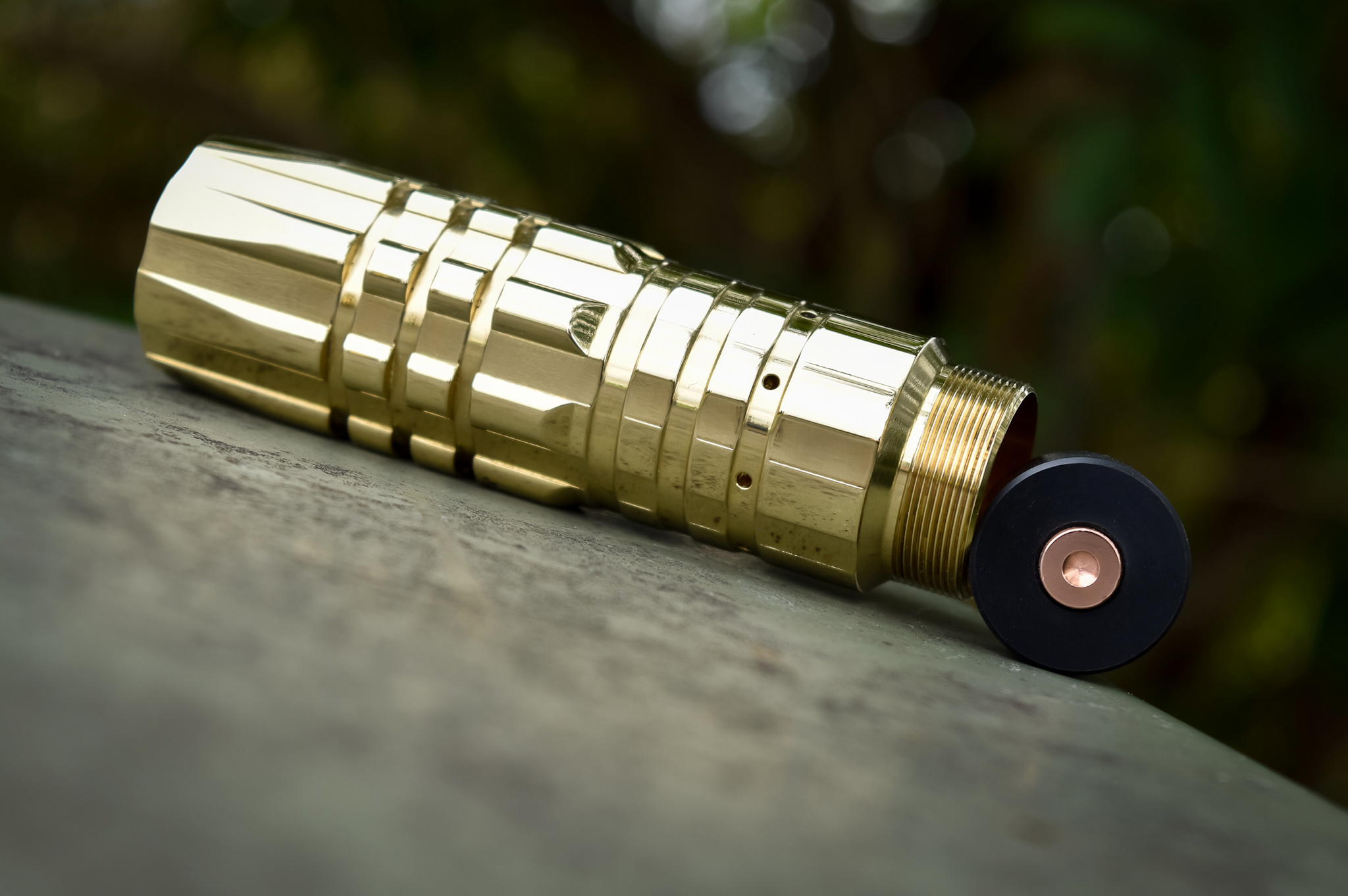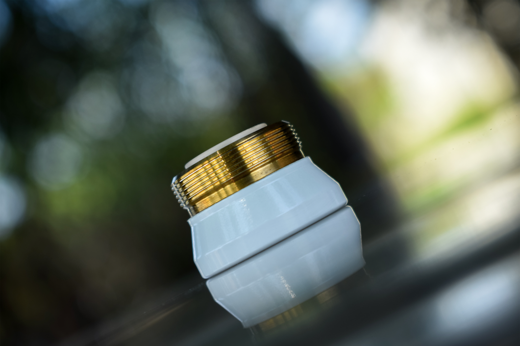 → Gloss White 21700 housing assembly includes: gloss white low rider smooth housing (brass underneath), copper Collector Series button, copper low rider contact and two thin magnets.